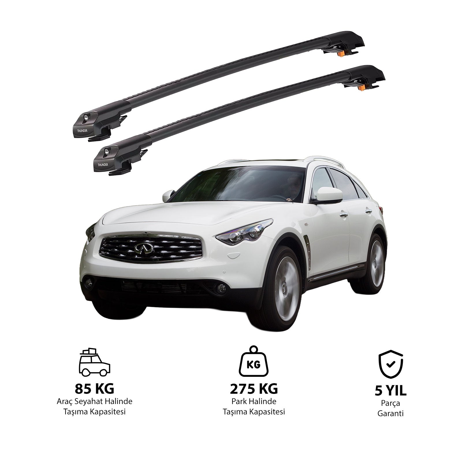 TRX1 Thunder Carrier Kilitli Ara Atkı, özellikle INFINITI EX 2008-2013 yıllarındaki araçlarına uyumlu olarak tasarlanmış, aracınızın tavanına monte edilen ve taşıma kapasitesini önemli ölçüde artıran bir üründür. Bu ürün,bisiklet, kayak, snowboard, merdiven, çadır ve bagaj gibi birçok farklı eşyayı güvenli bir şekilde taşımanızı sağlar.